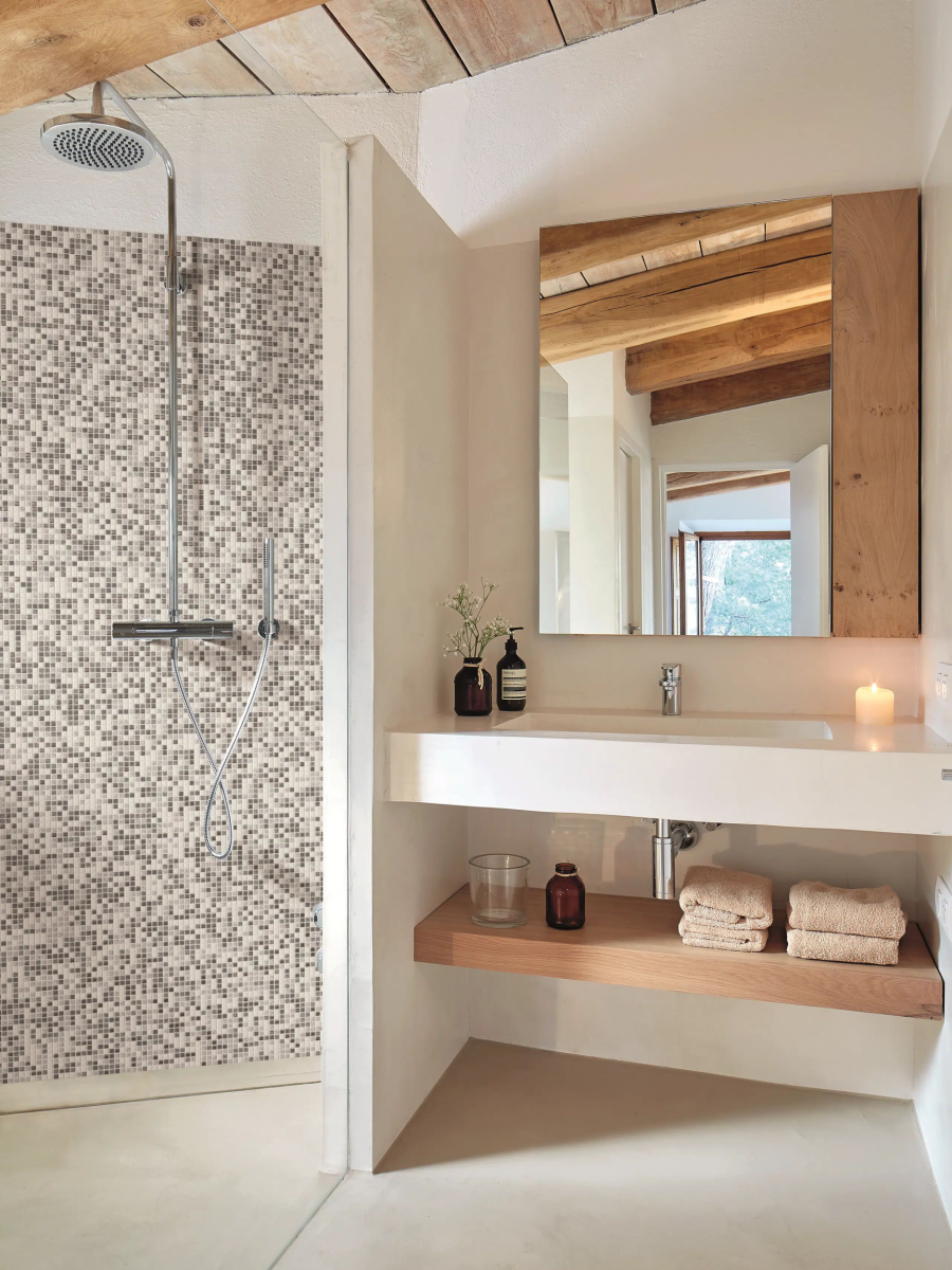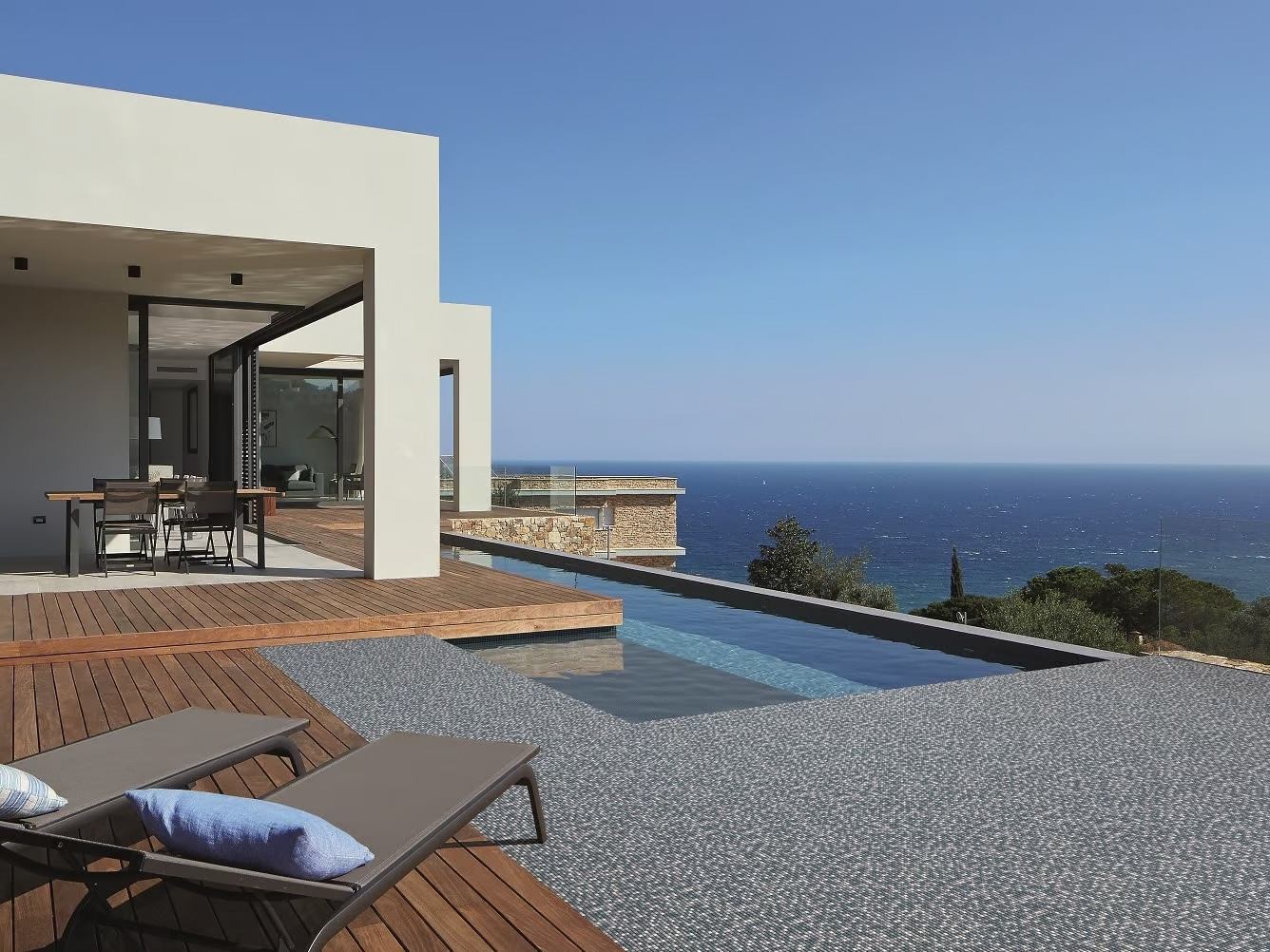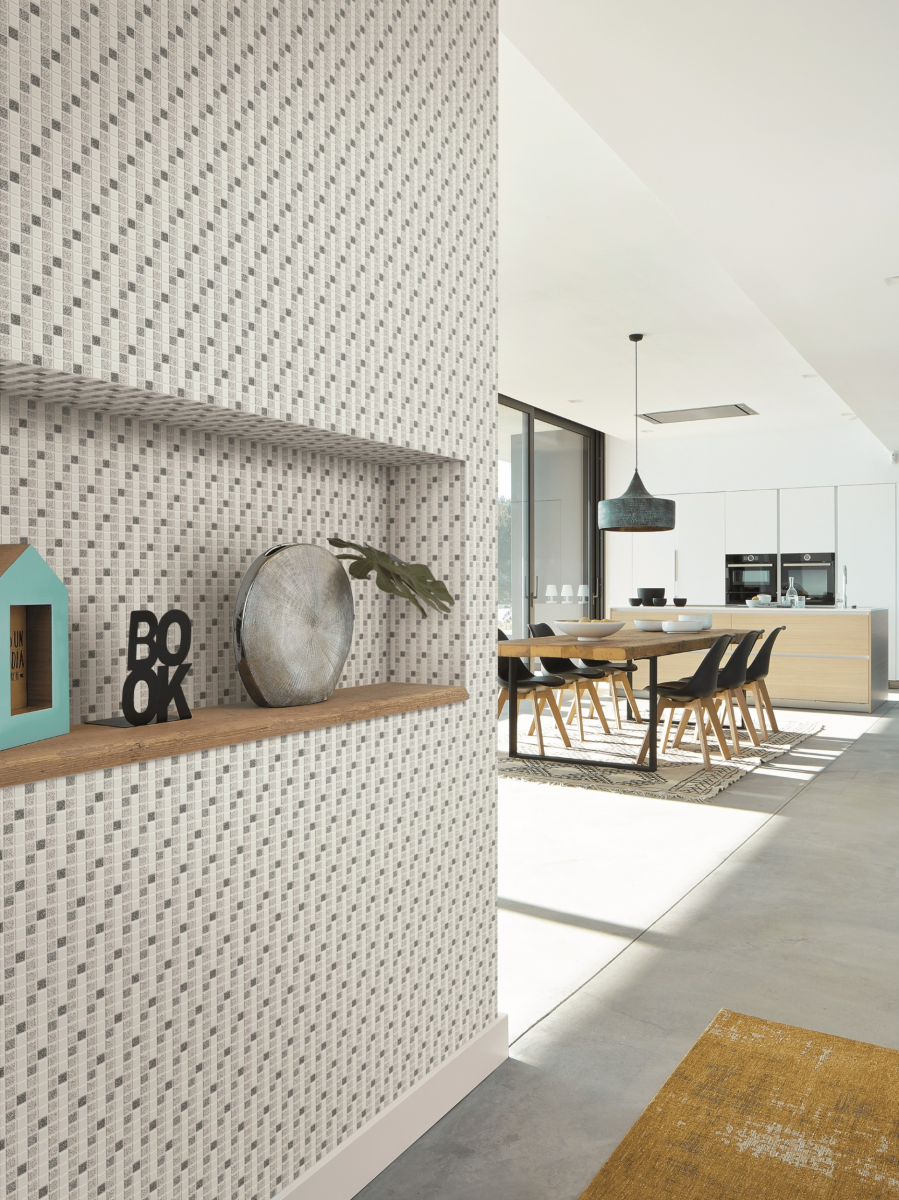 Создан из мини плиток 5 оттенков, гармонично сочетаемых между собой. Повторяющийся геометрический рисунок панно создает бесшовный узор и возможность декорировать внутренние помещения, открытые зоны.