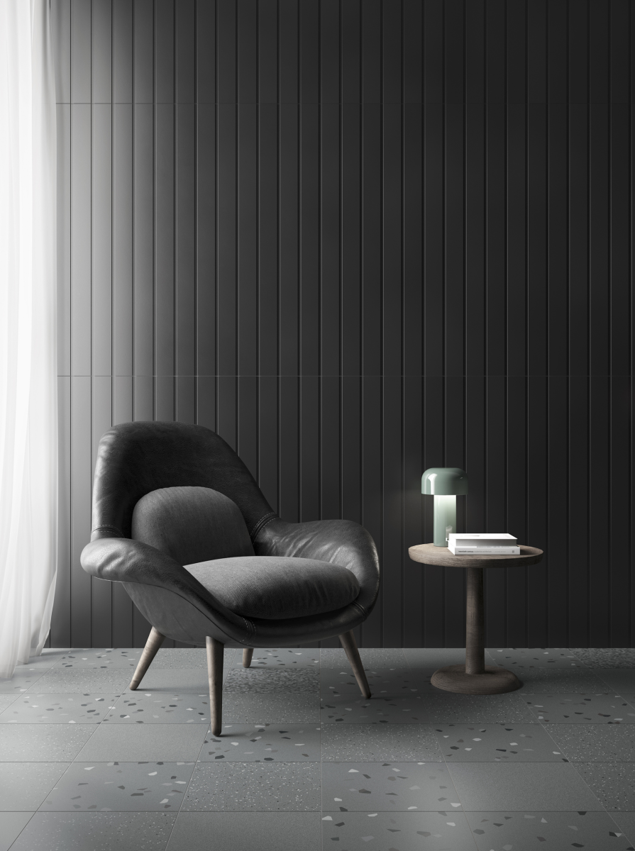 Коллекция Perlinato от бренда Micro.- это проект, вдохновленный классической текстурой обшивки досками, которая была популярна в 70-х годах прошлого века. Керамические планки создаются с помощью штампа и постукивания по длинным сторонам, что позволяет стыкам элементов формировать монолитную поверхность без использования затирки. Плитка имитирует деревянные поверхности с максимальной точностью, воссоздает их эстетику и тепло.