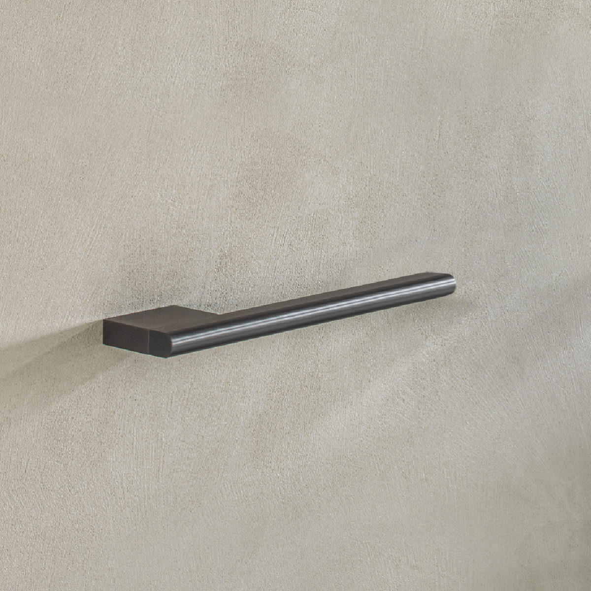 Полотенцедержатель в сатинированной стали отличается строгой линией и минималистичной формой. Настенное крепление слева позволяет органично разместить изделие, сохраняя общий баланс интерьера. Длина 400 мм делает аксессуар удобным для повседневного использования.