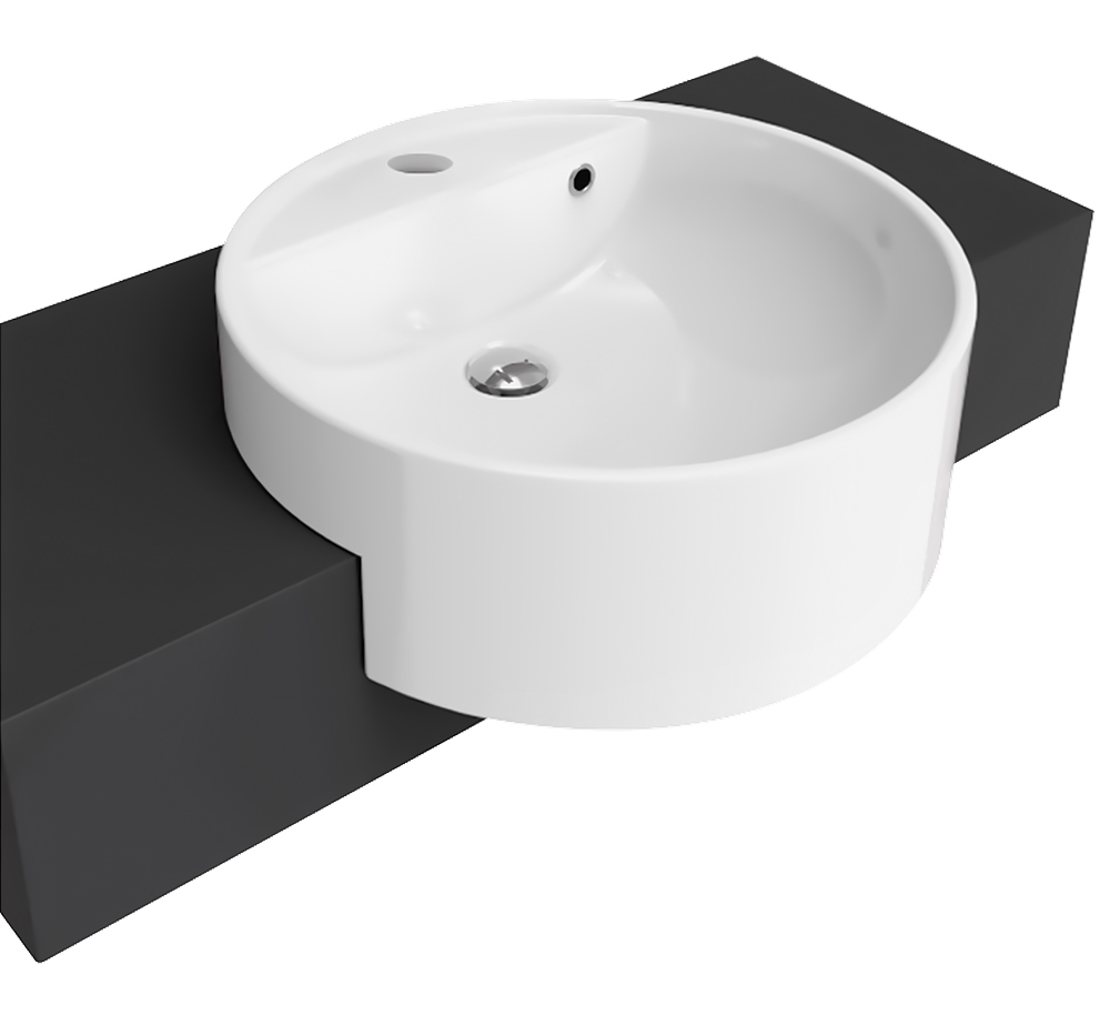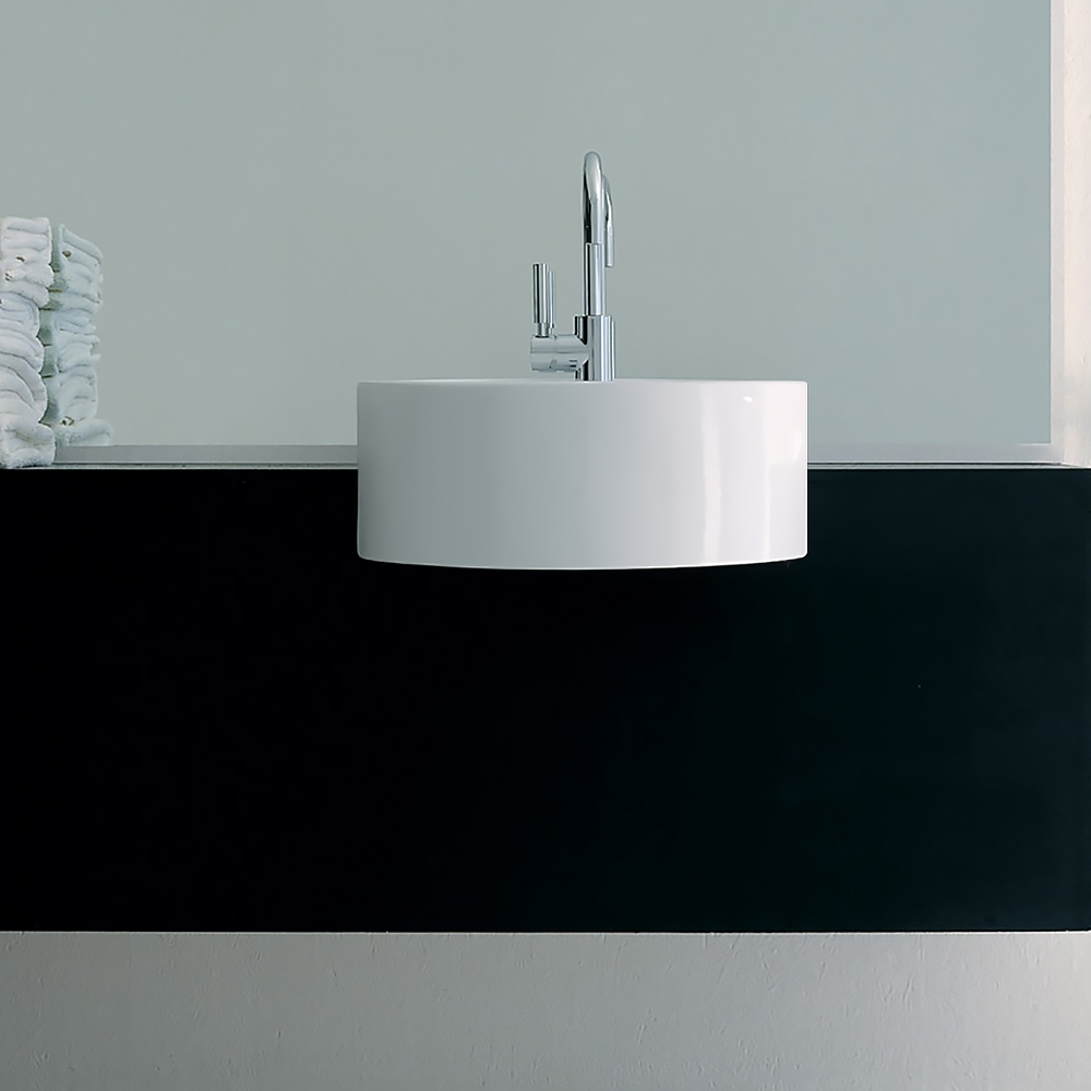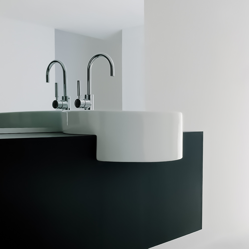 Раковина Flaminia Twin объединяет функциональность и лёгкий современный стиль. Круглая форма диаметром 525 мм с высотой чаши 200 мм при установке создаёт аккуратный и сбалансированный образ. Полувстраиваемая конструкция позволяет частично утопить раковину в столешницу, сохранив при этом эффект лёгкости и визуальной чистоты.