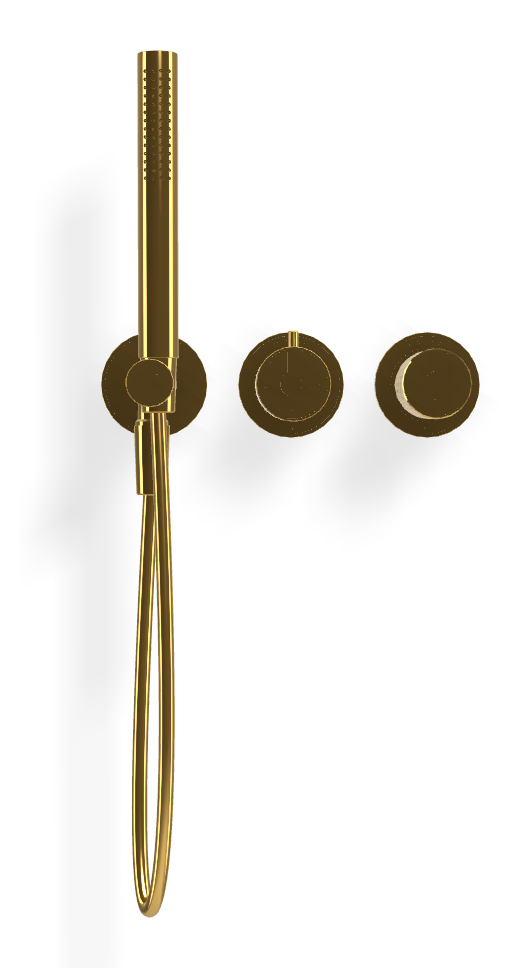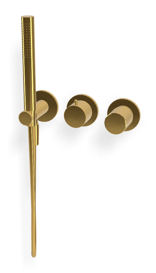 Золотая отделка создаёт мягкое свечение и подчёркивает геометрию корпуса. Такой оттенок уместен в интерьерах с натуральным камнем, тёплой плиткой, элементами в светлых или глубоких тонах. Ручка X Collection усиливает графичность смесителя и добавляет тактильную выразительность: настройка напора ощущается точной, а переключение между потребителями происходит последовательно и предсказуемо.