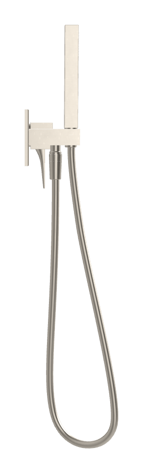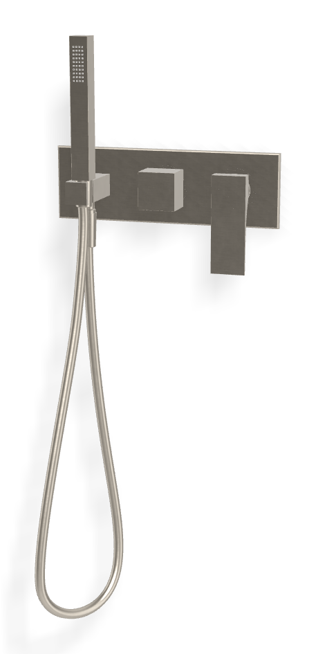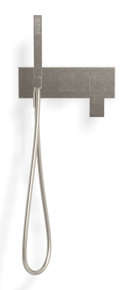 Брашированный никель создаёт мягкую матовую фактуру с деликатным металлическим блеском. Такой оттенок универсален: он вписывается в интерьеры с камнем, микробетоном, базовой керамикой или тёплыми древесными поверхностями. Ручной душ даёт ровный поток, а переключение между режимами ощущается чётким и стабильным. Внешняя часть формирует завершённый вид системы и подходит для использования с соответствующей встроенной частью.