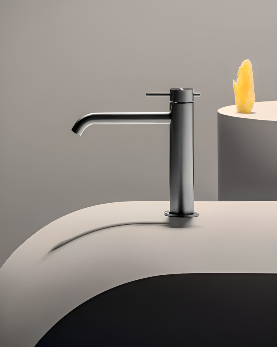Брашированная поверхность смесителя мягко рассеивает свет и создает сдержанный визуальный эффект. Однорычажный механизм обеспечивает плавное регулирование температуры и напора, а встроенный аэратор оптимизирует поток воды, снижая её потребление.