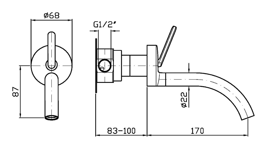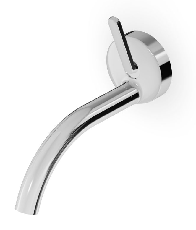 Хромированное покрытие подчеркивает чистоту геометрических линий и обеспечивает устойчивость к воздействию влажной среды. Излив демонстрирует характерный для коллекции диаметр 22 мм, определяющий пропорции всех элементов системы. Настенный монтаж создает минималистичную эстетику, а встраиваемый механизм позволяет скрыть технические компоненты для визуальной легкости композиции.