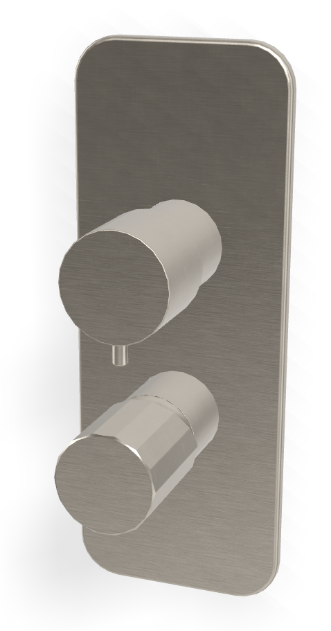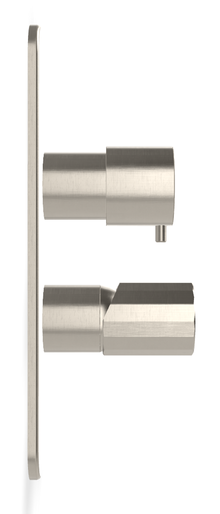 Брашированный никель создаёт мягкую матовую поверхность с деликатным металлическим свечением без резких отражений. Такой цвет гармонично сочетается со светлой керамикой, натуральным камнем, микробетоном и древесными фактурами. Ручка V Collection добавляет строгий графичный акцент и подчёркивает архитектурный характер серии. Переключение между потребителями ощущается чётко, а регулировка потока остаётся плавной и контролируемой.