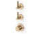Термостатический механизм обеспечивает точное поддержание заданной температуры воды, создавая безопасные и комфортные условия эксплуатации. Два независимых запорных вентиля позволяют индивидуально регулировать интенсивность потоков для различных сценариев использования. Брашированное золотистое покрытие создает благородный матовый эффект с бархатистой текстурой, устойчивый к воздействию влажной среды и механическим повреждениям.